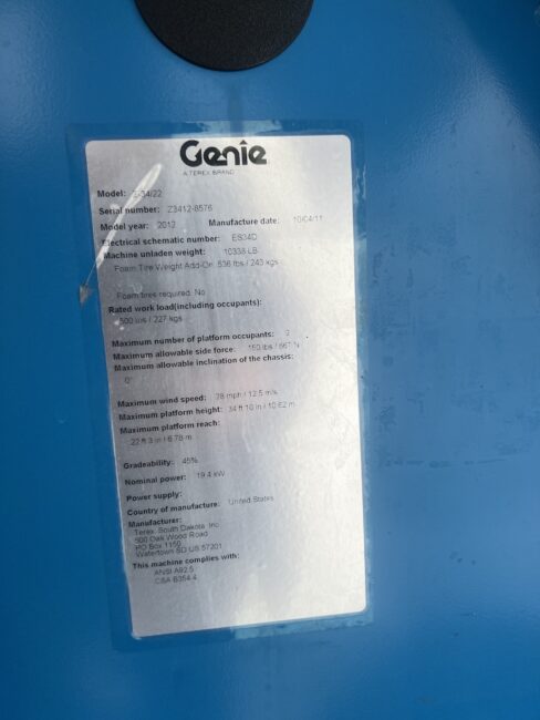 2012 Genie Z34/22- Kubota Diesel Engine, 4X4, Foam Filled Tires, 54” Power Basket, 22’ Platform Reach, 34’ Platform Height, 500lb Lift Capacity, Includes NDT Inspection, 4097.8 Hours, Stock #3368  $38,500