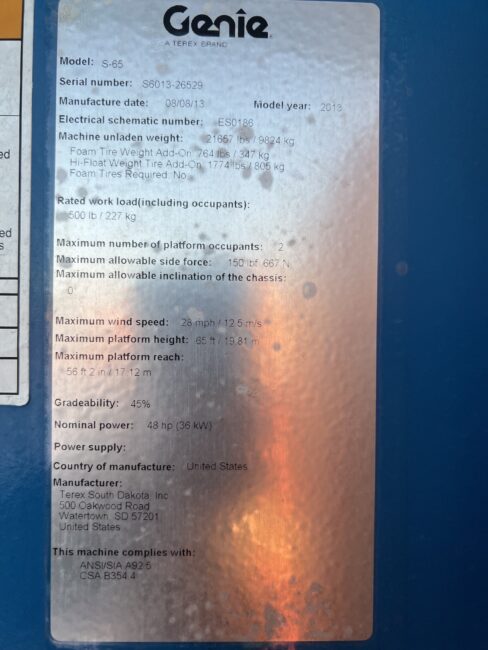 2013 Genie S65- Deutz Diesel Engine, Foam Filled Tires, Block Heater, 8 ft Power Basket, 56’ Platform Reach, 65’ Platform Height, 500lb Lift Capacity, Includes NDT Inspection, 6342.6 Hours, Stock #3339 $42,500