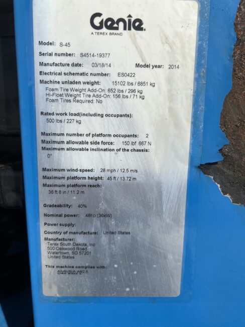 2014 Genie S45- Deutz Diesel Engine, 4X4, Block Heater, Foam Filled Tires, 8 ft Basket, 36’ Platform Reach, 45’ Platform Height, 500lb Lift Capacity, Includes NDT Inspection, 4884.1 Hours, Stock #3367 $38,500