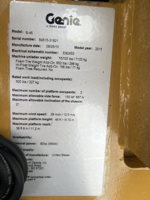 2015 Genie S45- Dual Fuel Ford MSG-425 Engine, Foam Filled Tires, Block Heater, 8 ft Power Basket, 36’ Platform Reach, 45’ Platform Height, 500lb Lift Capacity, Includes NDT Inspection, 1229.4 Hours, Stock #3334 $48,500