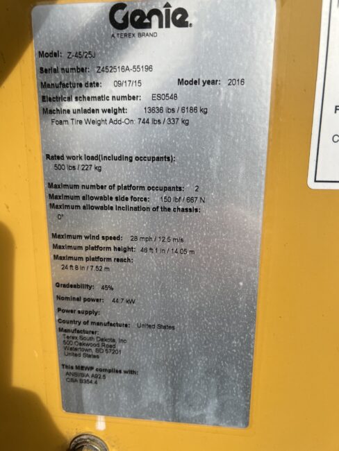 2016 Genie Z45/25J- Dual Fuel Ford MSG-425 Engine, Foam Filled Tires, Block Heater, 6 ft Power Basket, 25’ Platform Reach, 45’ Platform Height, 500lb Lift Capacity, Includes NDT Inspection, 1532.9 Hours, Stock #3336 $54,500