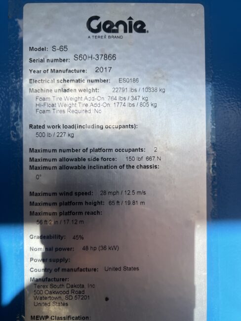 2017 Genie S65- Deutz 2.9 4 Cylinder Diesel, Block Heater, Foam Filled Tires, 8 ft Power Basket, 56’ Platform Reach, 65’ Platform Height, 500lb Lift Capacity, Includes NDT Inspection, 1930.8 Hours, Stock #3325 $56,500