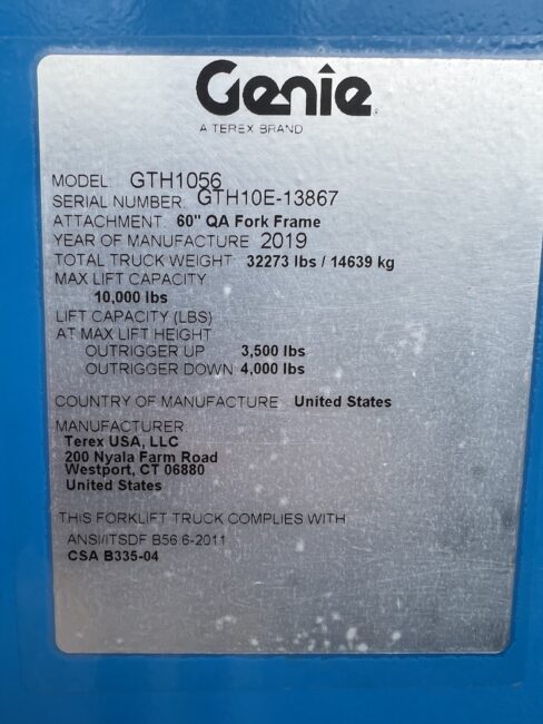 2019 Genie GTH-1056 – Deutz Diesel, 4X4, Heat, Manual Quick Connect, 5ft Tilt Carriage, 6’ Forks, 56’ Lift Height, 10,000lb Lift Capacity, Foam tires, 7468.5 Hours, Comes with Current NDT Inspection Stock #3318 $92,500